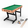 Многофункциональный игровой стол MERCURIAL 4ft — то, что нужно для большой компании! Играйте в футбол, бильярд, настольный теннис и аэрохоккей на одном столе, легко меняя игровые поля. Яркое оформление и стильный дизайн сделают игру ещё более увлекательной. Особенности стола Игровое поле Игровые поля легко менять, они изготовлены из МДФ, ламинированного ПВХ с ярким принтом игровой разметки. Сам стол компактный, не занимает много места, а игрового пространства достаточно, чтобы получить настоящее удовольствие во время игры в домашней обстановке с друзьями или семьёй. Толщина бортиков стола 30 мм, а высота - 12 мм. Размеры и оформление игрового поля Футбольное поле: 104 х 58 см, толщина 3 мм, с зелёной поверхностью и разметкой, установлены телескопические хромированные стержни 13 см в диаметре с футбольными игроками. Хоккейное поле: размер 93 х 47,5 см, толщина 4,75 см, покрытие бело-красное, с разметкой. Теннисный стол: классическое синее поле с разметкой для сетки 96 х 50 см, толщина 4,75 мм. Бильярдное поле: стол с мягким зелёным покрытием размером 97 х 51 см, толщиной 4,75 мм; ширина лузы 6,7 см. Ножки стола Конструкция стола устойчива, что актуально для азартных и эмоциональных игроков, особенно при игре в футбол. Прочность и устойчивость ему придают ножки шириной 80 мм и толщиной 13 мм из МДФ с ПВХ покрытием и перекладины толщиной 9 мм. Комплектация Стол для домашних игр 4 в 1 поставляется со всеми комплектующими: 2 мяча для футбола; 2 шайбы и 2 биты (6 см в диаметре) для хоккея; 2 ракетки, 2 теннисных мяча и сетка; 2 кия (91 см), шары (37 мм в диаметре), треугольник и щётка для бильярда. Не нужно ничего приобретать отдельно: играть можно сразу после покупки. А механический счётчик голов на полях для футбола и хоккея сделают игру ещё увлекательнее.